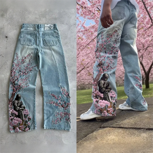 Vintage Cherry Blossom Black Knight Embroidery Jeans Y2K Retro Baggy Straight Denim Blue Wash Casual Pants for Men