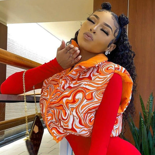 gilet d'hiver imprimé chaud à col montant, manteau court en coton